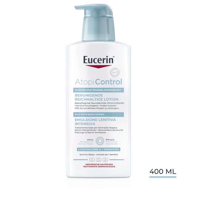 La Lotion Riche Apaisante Eucerin® AtopiControl est une lotion à usage quotidien spécialement formulée pour apaiser et hydrater intensément la peau irritée et sujette aux démangeaisons. Cette lotion eau-dans-huile, qui pénètre rapidement, est enrichie en Licochalcone A apaisante, en Céramides et en huiles oméga pour renforcer la barrière cutanée, soulager la sécheresse et les sensations de démangeaisons*. Grâce à une application régulière, l'état de la peau s'améliore sensiblement et la peau devient plus douce et lisse.