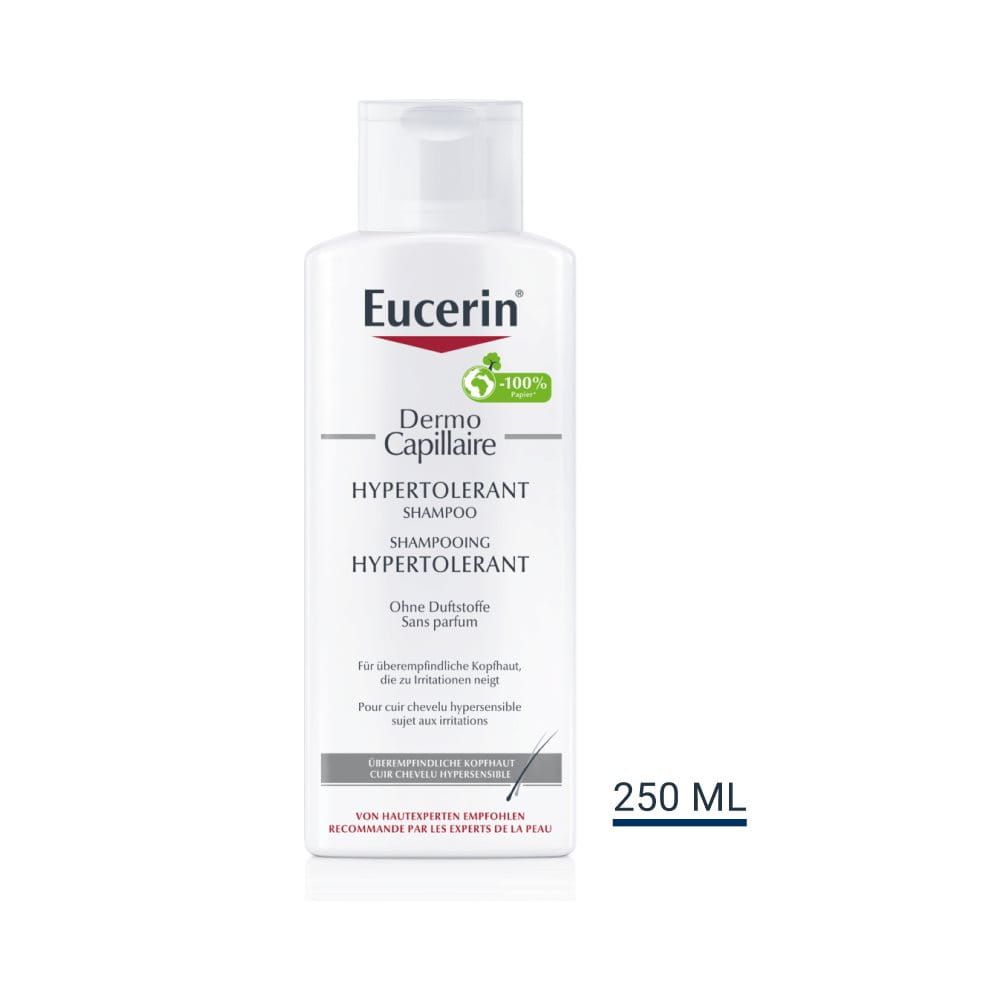EUCERIN DermoCapillaire Shampoing Haute Tolérance a été développé spécialement pour ceux qui ont un cuir chevelu hypersensible. Sa formule très douce permet un lavage très délicat, tout en prévenant la sécheresse du cuir chevelu et en soulageant les sensations d'irritations, même si vous avez un cuir chevelu à problèmes ou hyper-réactif. Il soulage et apaise les sensations de démangeaisons dès la première utilisation.