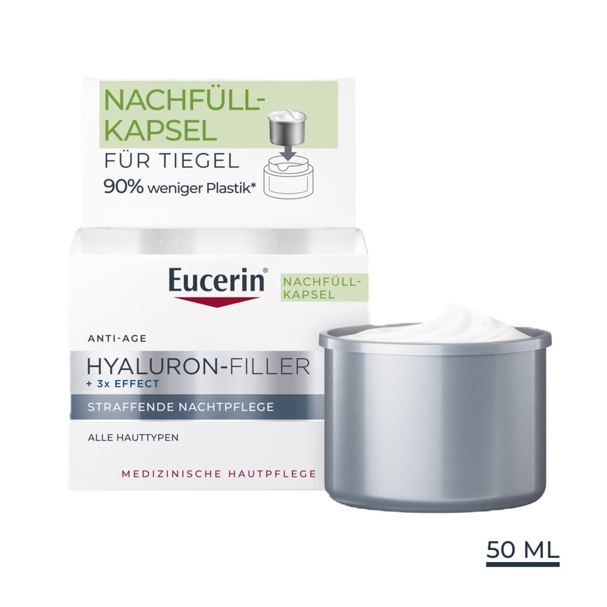 Le Soin de nuit raffermissant Eucerin Hyaluron-Filler +3x Effect combat le processus de vieillissement. Il comble les rides profondes, raffermit visiblement la peau et la régénère pendant la nuit. La capsule de recharge contient 90% de plastique en moins que le pot Hyaluron-Filler courant.