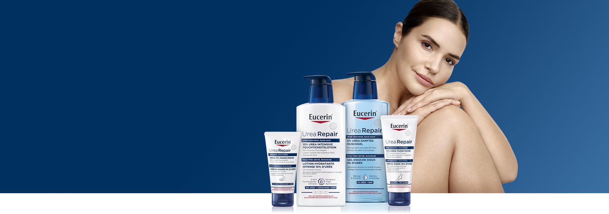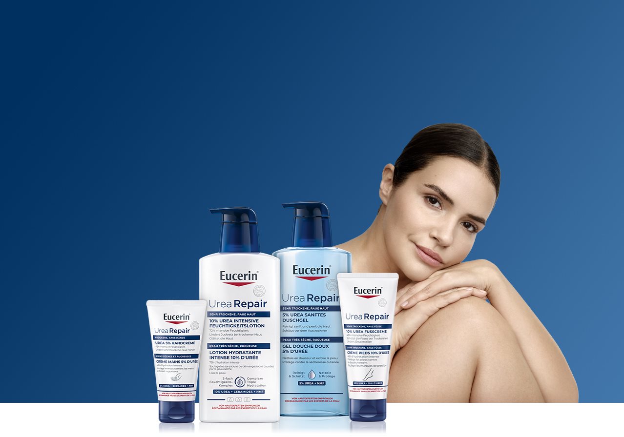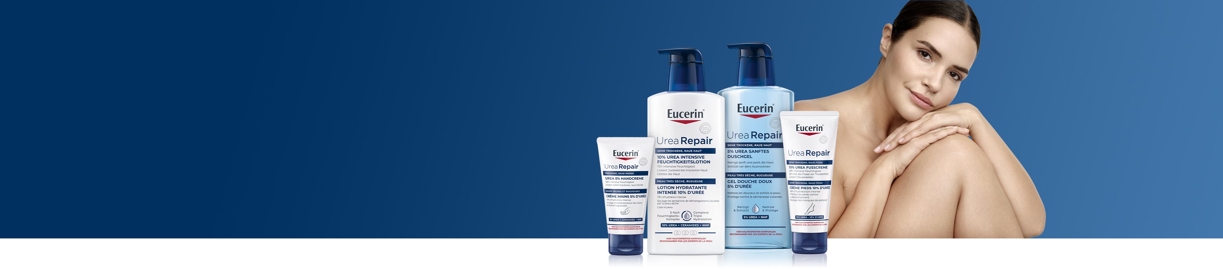 Eucerin® UreaRepair propose une gamme complète de produits comprenant un Gel Douche, des lotions corporelles (y compris des produits pour le soin des mains et des pieds) et une crème de soin intensif pour les zones à problèmes de peau extrêmement sèche. Ces produits sont disponibles avec différentes concentrations d’Urée, la concentration variant en fonction du niveau de sécheresse cutanée.