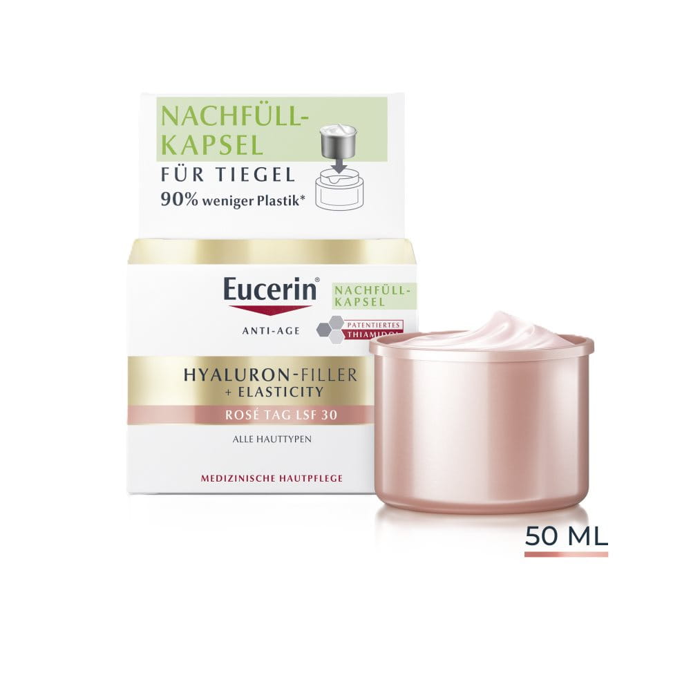 Cette recharge du Soin de jour HYALURON-FILLER + ELASTICITY rose SPF 30 contient 90% de plastique en moins que le pot standard d'Eucerin. En utilisant cette recharge, vous contribuez à réduire les déchets plastiques et à créer un cycle de produits plus durable. Compatible avec tous les pots de soin du visage Eucerin.