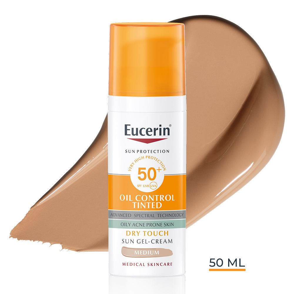 Eucerin SUN Face Oil Control Gel-Creme Tinted medium SPF 50+ est une protection solaire teintée à usage quotidien pour les peaux grasses et sujettes aux imperfections, qui unifie immédiatement le teint et matifie durablement.