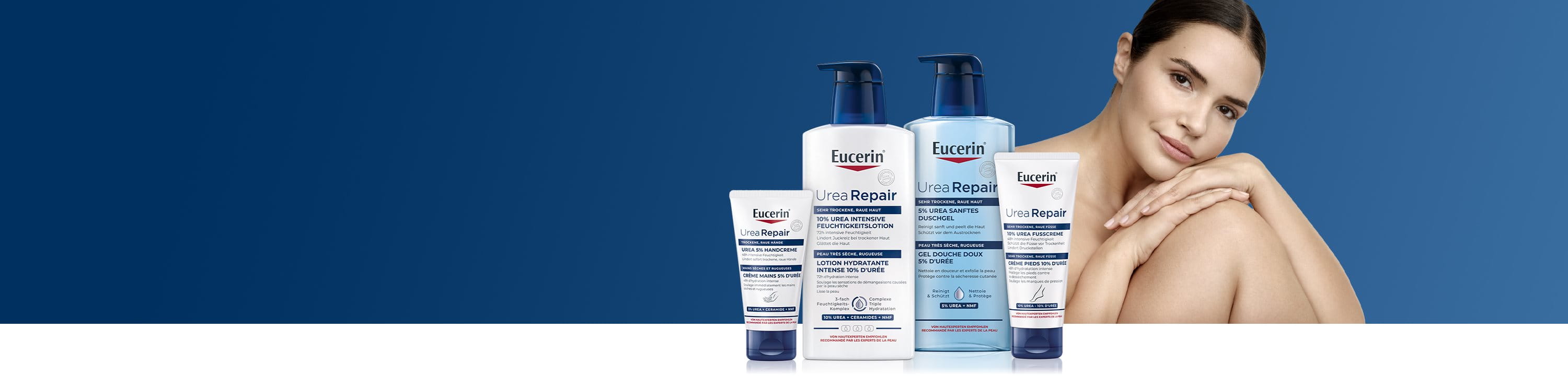 Eucerin® UreaRepair propose une gamme complète de produits comprenant un Gel Douche, des lotions corporelles (y compris des produits pour le soin des mains et des pieds) et une crème de soin intensif pour les zones à problèmes de peau extrêmement sèche. Ces produits sont disponibles avec différentes concentrations d’Urée, la concentration variant en fonction du niveau de sécheresse cutanée.